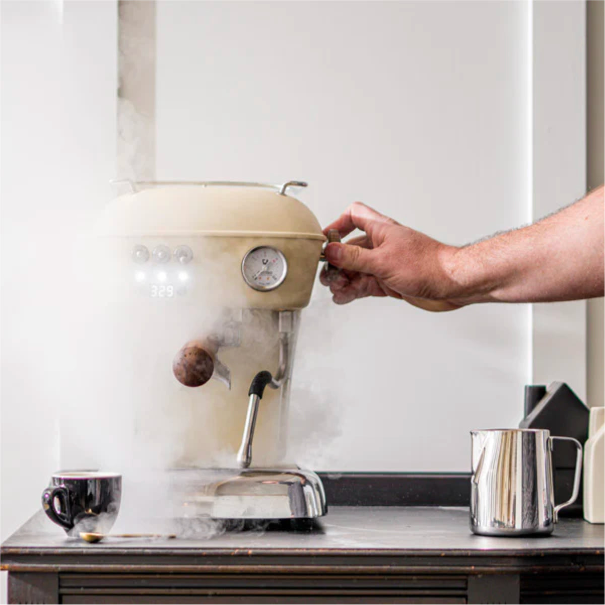The Ascaso Dream Espresso Machine seamlessly blends retro aesthetics with modern functionality, making it perfect for creating "impulsive espresso" and swiftly transitioning to steaming milk, ideal for busy mornings. The Dream's new PID system offers advanced features including temperature and offset control, pre-infusion capabilities, power-saving modes, and the option to program single or double shots.