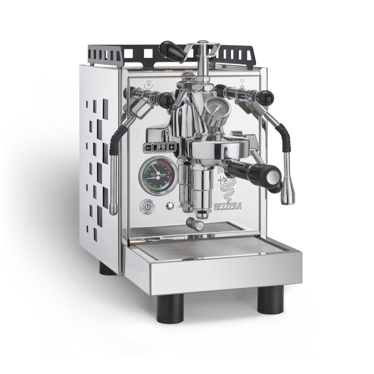 Structure: Crafted with a sleek stainless steel body and adorned with smooth levers and handles, the Aria Top exudes elegance and professionalism. The manual flow profiling feature adds a touch of excitement to coffee extraction, allowing users to unleash the full potential of their beans with precision. Unique box cutouts on the side panels not only enhance its aesthetic appeal but also reflect Bezzera's attention to detail and craftsmanship.