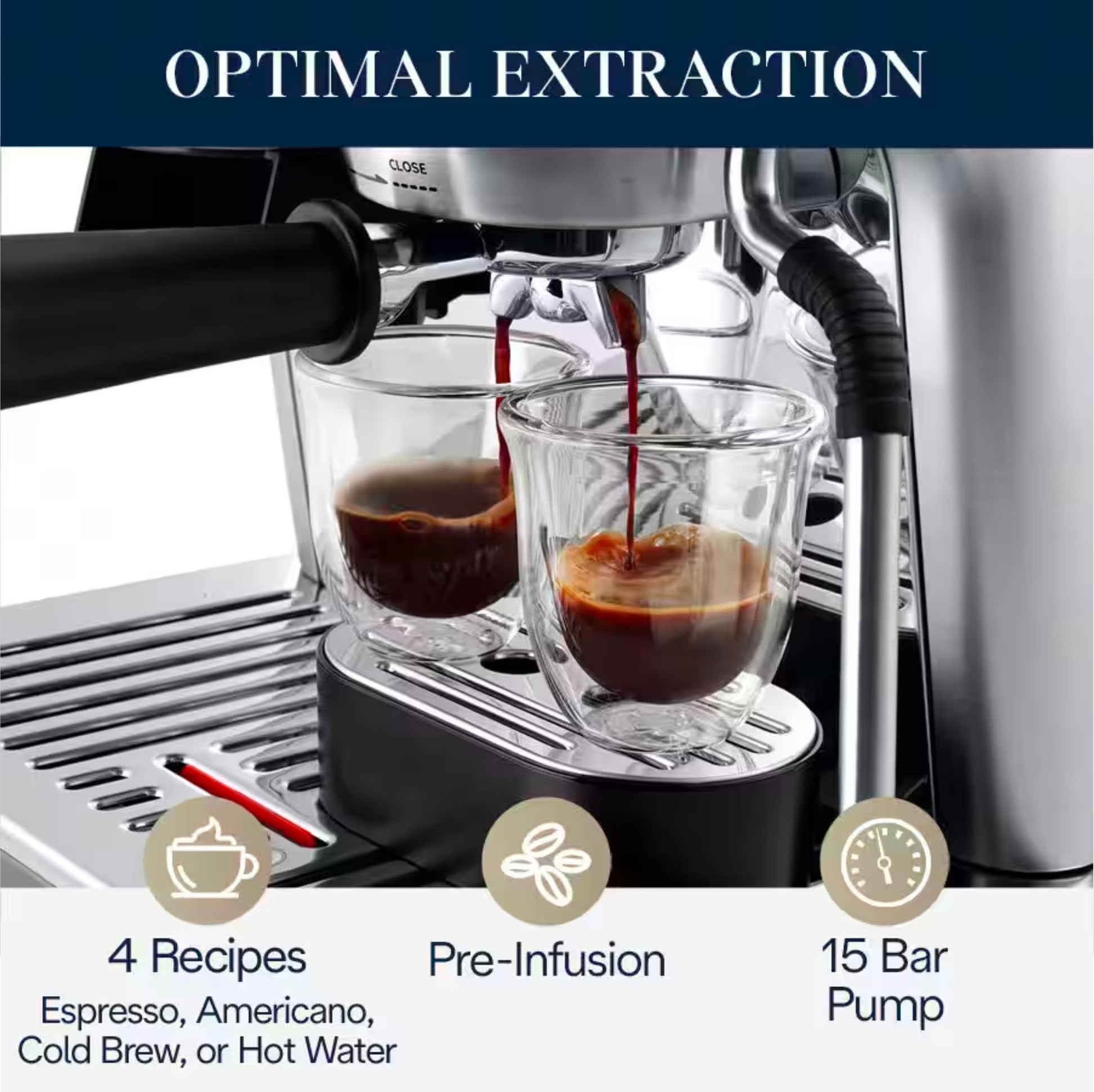 Pressure Control: The machine is equipped with a 15-bar Italian pump, ensuring the perfect pressure throughout the brewing process. It ranges from low pressure during pre-infusion to the optimal 9 bars of high pressure during extraction.