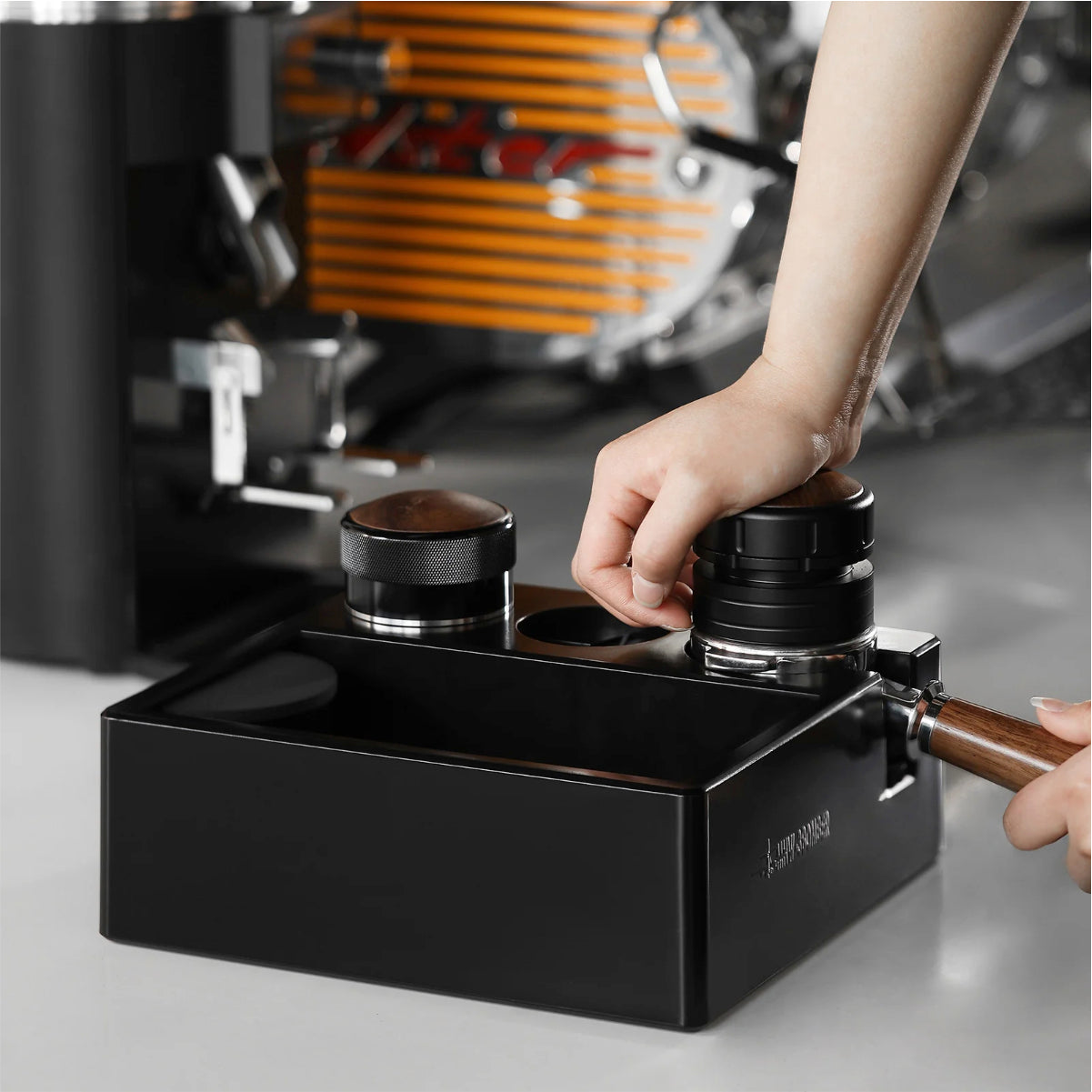 - Height Adjustable: Features a silicone rotary button for easy height customization, accommodating various portafilters and ensuring even ground distribution.